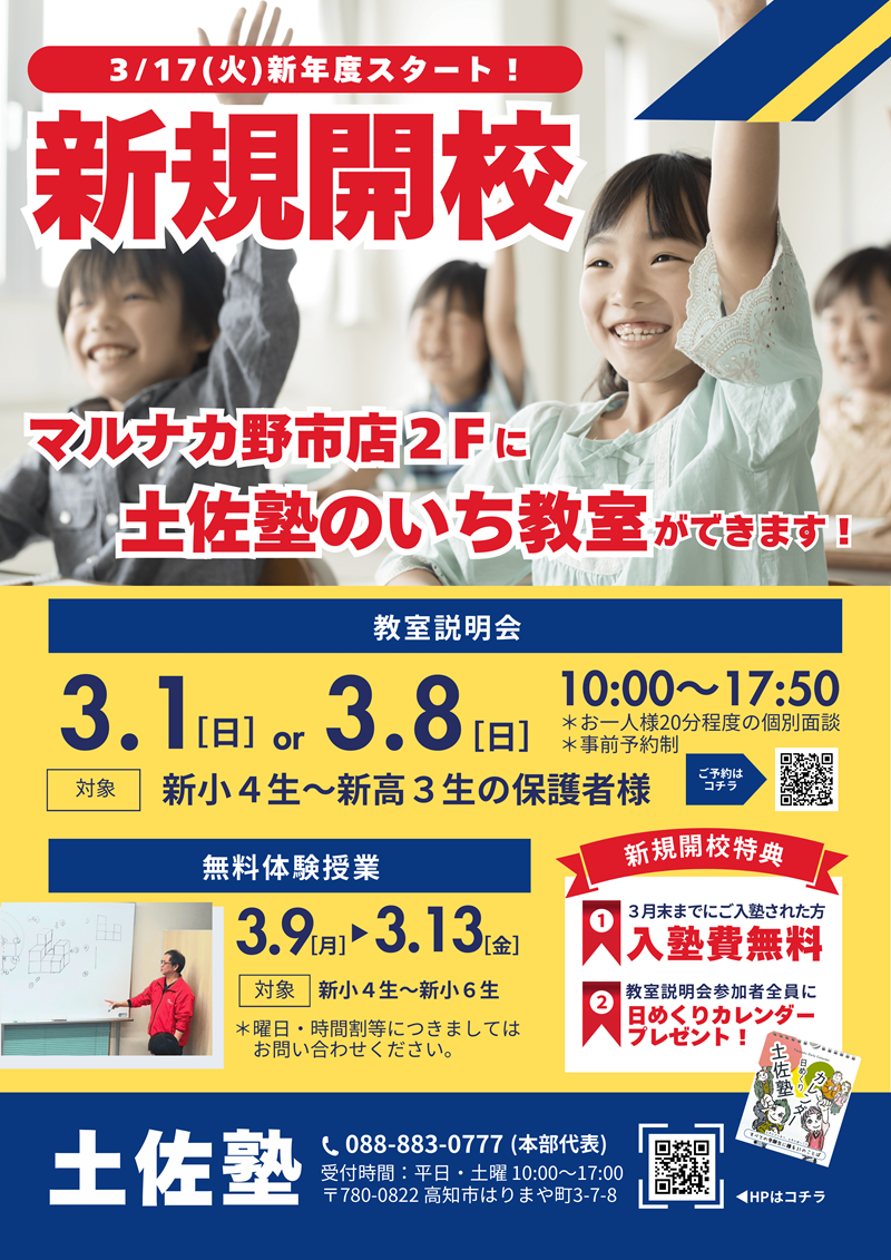 マルナカ野市店2階に、土佐塾の新教室がオープンいたします。