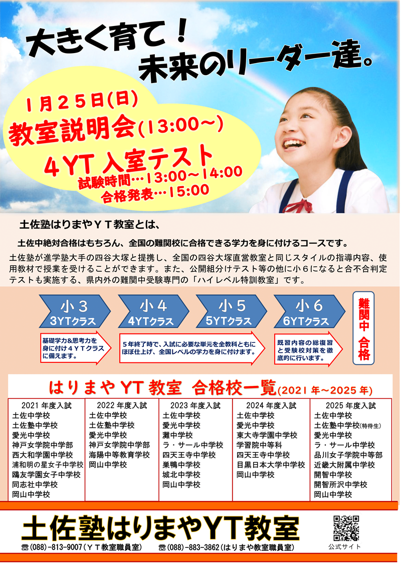 はりまやYT教室の入室説明会(個別面談)は随時行っております。お気軽にお問い合わせください。はりまやYT教室 ☎ 088-813-9007(受付時間14:00~20:00,日祭を除く)